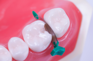 FenderMate is a pre-curved, one-piece sectional matrix and wedge that provides for quick, safe and predictable composite restorations, with a tight contact and cervical sealing. FenderMate is designed to be inserted either buccally or lingually. The matrix reaches from the base of the wedge to just above the occlusal surface. The side of the wedge facing the adjacent tooth has an angled wing. During insertion, the wing presses the matrix firmly against the preparation, giving a tight seal at the cervical margin. To form the contact point the matrix has a pre-contoured indentation, which mimics natural contours. When rubber dam is not used, it is suggested to secure FenderMate with waxed floss.
